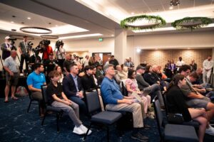 The media takes notes during a press conference at Hyatt House Tampa Airport Hotel Tuesday, Dec. 30, 2025. The press conference hosted Iowa football head coach Kirk Ferentz and Vanderbilt head coach Clark Lea to address the media ahead of the matchup on Wednesday, Dec. 31. (Samantha DeFily/The Daily Iowan)